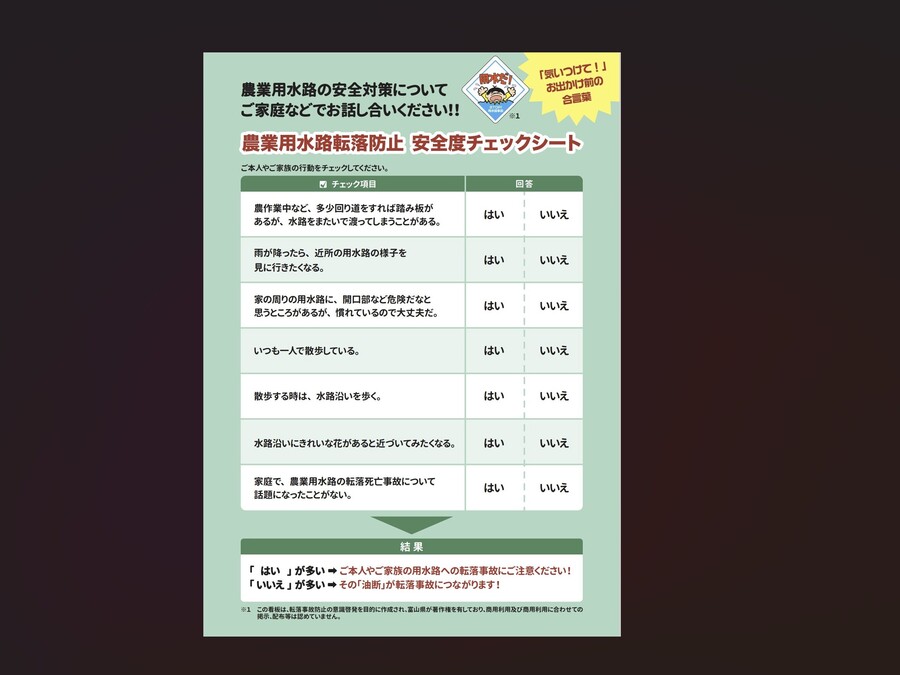 県内で多発する農業用水路での転落事故を防止するため、4月20日から5月20日までの1か月間を「春の農業用水路転落事故防止強化期間」として安全啓発、安全点検活動を展開しています。この時期は農業用水路の水量が増える時期であることから、農業用水路付近での通行や作業する際には、転落防止等に十分に気をつけましょう。